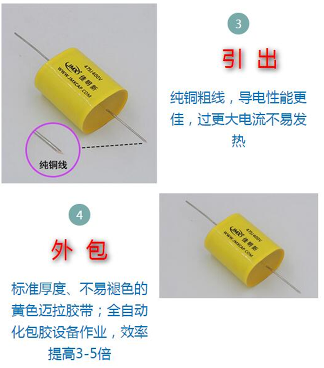 CBB20為無(wú)感結(jié)構(gòu),用金屬化聚丙烯膜作電介質(zhì)/電極繞制而成,引線采用鍍錫銅包鋼線,外層用聚酯膠帶包裹,兩端灌注環(huán)氧樹(shù)脂。 體積小,重量輕;容量穩(wěn)定性好;自愈性能優(yōu)異;高頻損耗小;廣泛用于高頻、直流、交流和脈沖電路中。