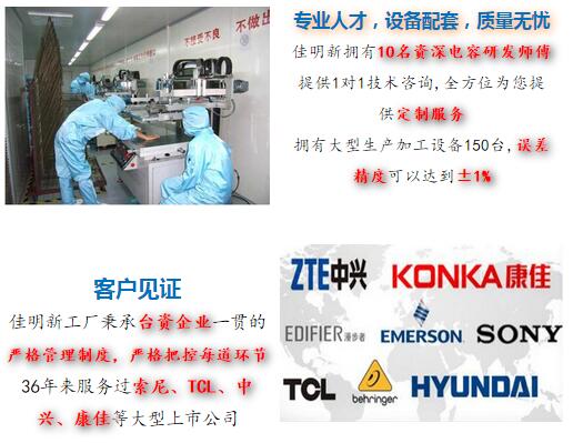 2017年12月28日正式更名為深圳佳名興電容有限公司 佳名興JMX廣東省惠州市電容器工廠占地面積13149平米,廠房面積8227平方米,每年生產(chǎn)的超級(jí)電容(單體、模組、方案定制)薄膜類電容(包括:金屬化薄膜電容、軸向薄膜電容,工業(yè)級(jí)電源用薄膜電容、長(zhǎng)壽命薄膜電容、等)軸向鋁電解電容、電力電容器、雙面金屬化薄膜電容等被動(dòng)元器件達(dá)8-13億只 佳名興JMX電容器60%-70%以上產(chǎn)品出口歐美,印度,東南亞等世界各地,30%-40%銷往中國(guó)大陸,產(chǎn)品規(guī)格齊全,體積小,可靠性優(yōu)良,穩(wěn)定性好,價(jià)格合理 佳名興JMX電容器被廣泛用于:汽車音響,車載分音器,音響分頻器,專業(yè)音響功放,衛(wèi)星通訊設(shè)備,LED驅(qū)動(dòng)電源,LED節(jié)能燈,開(kāi)關(guān)電源及電腦周邊產(chǎn)品等各個(gè)電子行業(yè)