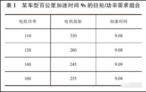 d)同一車(chē)型,當(dāng)提升電機(jī)的驅(qū)動(dòng)功率時(shí),可以減小對(duì)扭矩的需求。即不同的扭矩/功率組合,可以實(shí)現(xiàn)相同的0-100km/h 加速時(shí)間要求。