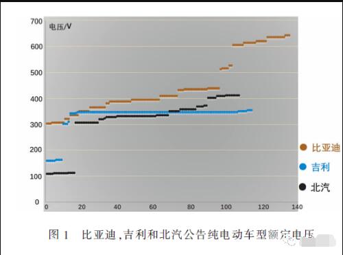 比亞迪,吉利和北汽新能源公告的純電動(dòng)車(chē)型額定電壓如圖1 所示。三個(gè)國(guó)內(nèi)較大的新能源生產(chǎn)廠家中,只有比亞迪公告了少量的高電壓平臺(tái)車(chē)型。