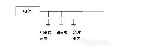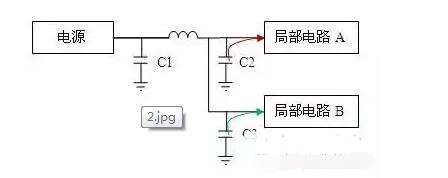 圖中電源為A和B供電。電流經(jīng)C1后再經(jīng)過(guò)一段PCB走線分開兩路分別供給A和B。當(dāng)A在某一瞬間需要一個(gè)很大的電流時(shí),如果沒有C2和C3,那么會(huì)因?yàn)榫€路電感的原因A端的電壓會(huì)變低,而B端電壓同樣受A端電壓影響而降低,于是局部電路A的電流變化引起了局部電路B的電源電壓,從而對(duì)B電路的信號(hào)產(chǎn)生影響。同樣,B的電流變化也會(huì)對(duì)A形成干擾。這就是“共路耦合干擾”。
