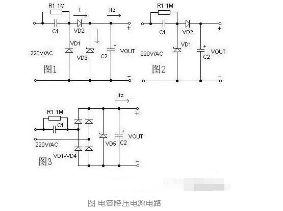 電容降壓式簡(jiǎn)易電源的基本電路如圖1,C1為降壓電容器,D2為半波整流二極管,D1在市電的負(fù)半周時(shí)給C1提供放電回路,D3是穩(wěn)壓二極管,R1 為關(guān)斷 電源后C1的電荷泄放電阻。在實(shí)際應(yīng)用時(shí)常常采用的是圖2的所示的電路。當(dāng)需要向負(fù)載提供較大的電流時(shí),可采用圖3所示的橋式整流電路。整流后未經(jīng)穩(wěn)壓的 直流電壓一般會(huì)高于30伏,并且會(huì)隨負(fù)載電流的變化發(fā)生很大的波動(dòng),這是因?yàn)榇祟愲娫磧?nèi)阻很大的緣故所致,故不適合大電流供電的應(yīng)用場(chǎng)合。