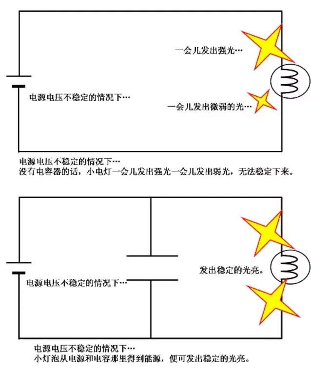 根據(jù)電容的狀態(tài),電源電壓不穩(wěn)定的情況下,穩(wěn)定的電燈發(fā)光。